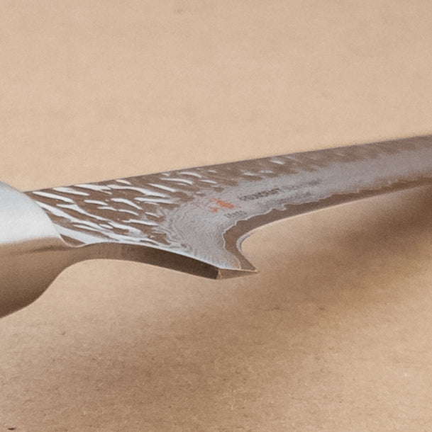 SUNCRAFT knives are made in historic Seki City, Japan, by a family owned manufacturer since 1948. The SENZO Classic series reflects a design characterized by an "East meets West" approach. The hammered pattern, known as"Tsuchime" on knife blade not only shows a level of hand-craft in its design but helps food release when cutting.