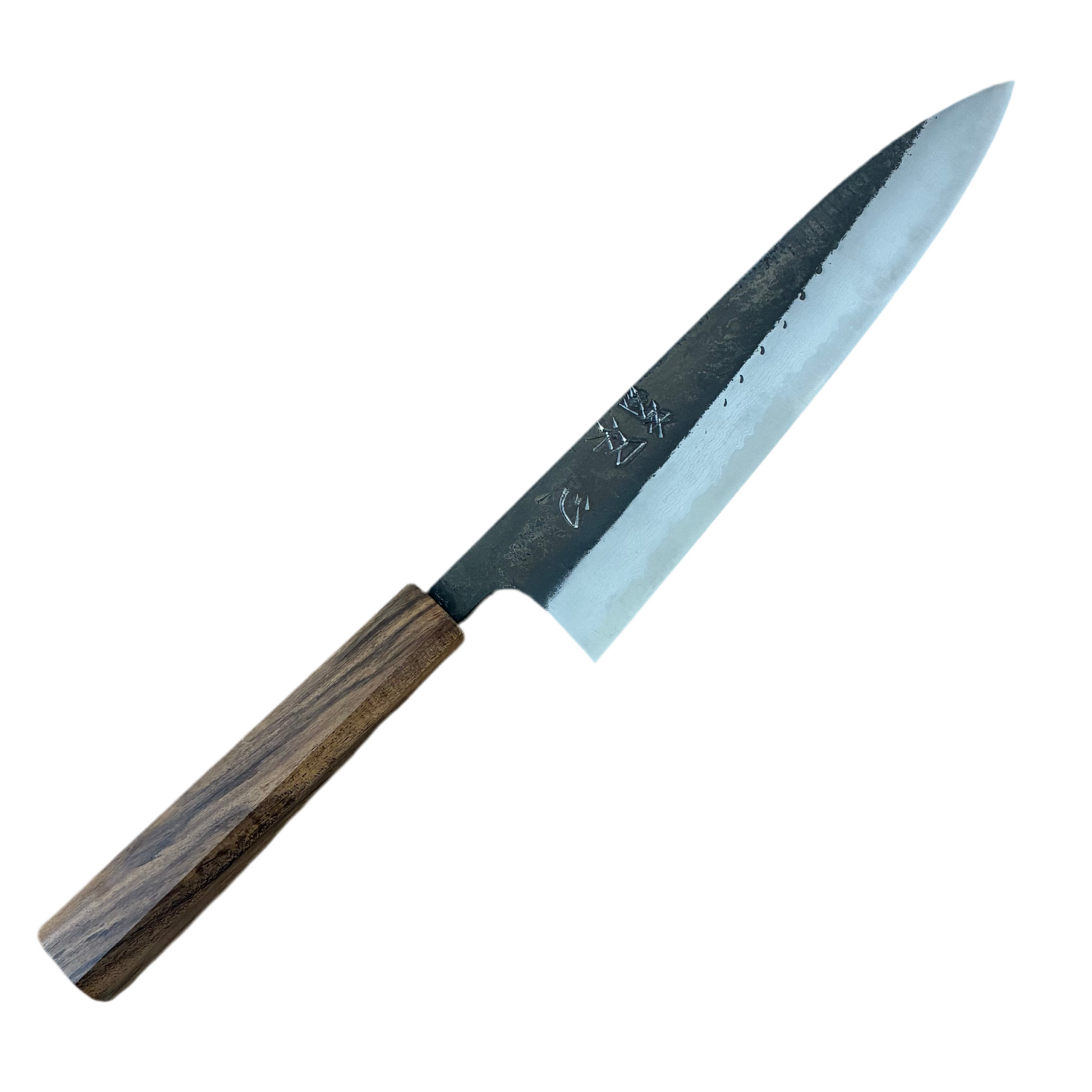 H & K’s house brand is called Hatsukoro. The brand is supplied by a handful of manufacturers from different notable knifemaking regions such as Seki and Tosa. Our first import shipment from H & K included the Shinkiro line. Shinkiro translates to “mirage”, and this line is stunning. Hand-forged damascus-clad Aogami Super steel at its finest. Our first batch was mated to multi-color pakka and maple octagonal handles. These blades are made specifically for H & K by a blacksmith named Takahiro Nihei in Fukushima. The tsuchime pattern in the damascus cladding is indicative of the expertise of the blacksmith. Nihei also makes knives for the wholesaler Konosuke Knives, and is highly regarded.