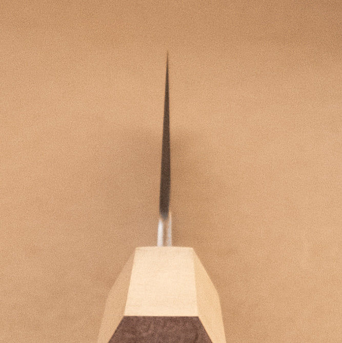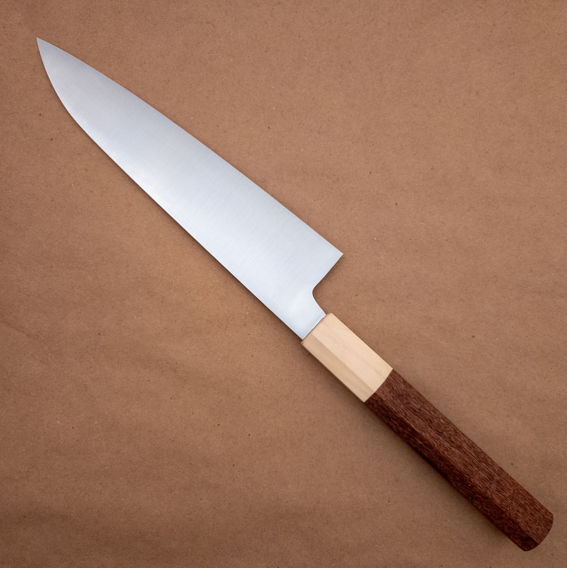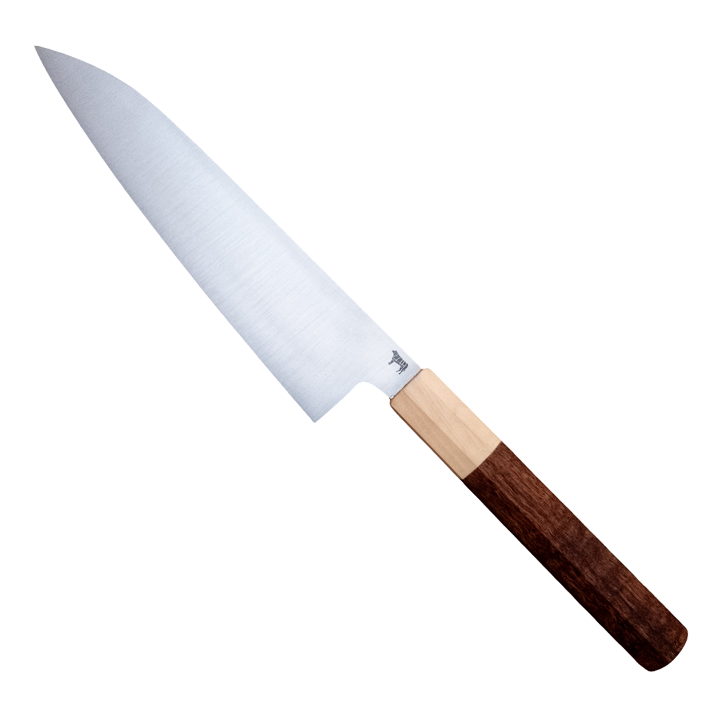 This 210mm gyuto-style chef knife is made W2 carbon steel heat treated to 62HRC.