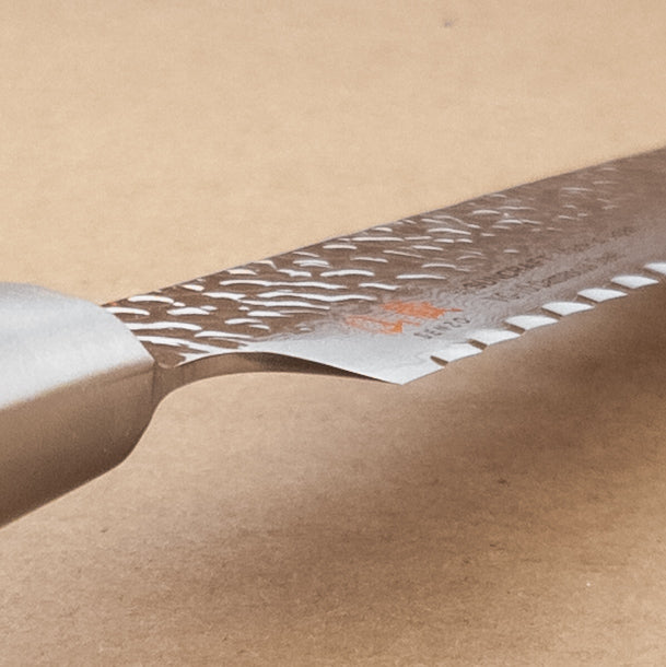 SUNCRAFT knives are made in historic Seki City, Japan, by a family owned manufacturer since 1948. The SENZO Classic series reflects a design characterized by an "East meets West" approach. The hammered pattern, known as"Tsuchime" on knife blade not only shows a level of hand-craft in its design but helps food release when cutting.