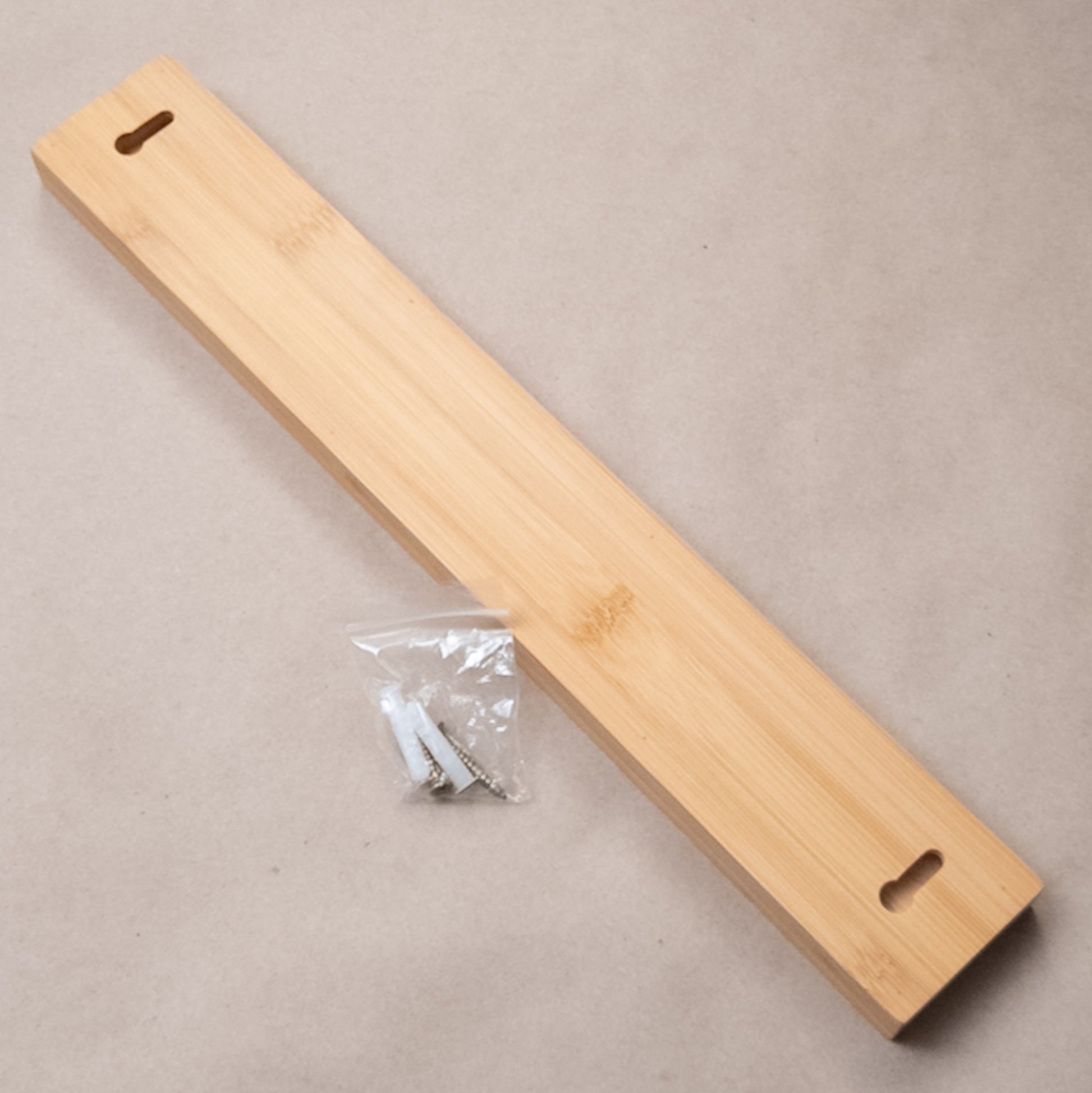 This magnetic knife board is approximately 16" long and displays up to 5 knives comfortably. It includes hardware necessary for installation and is a welcome accompaniment to any serious cook's kitchen organization.