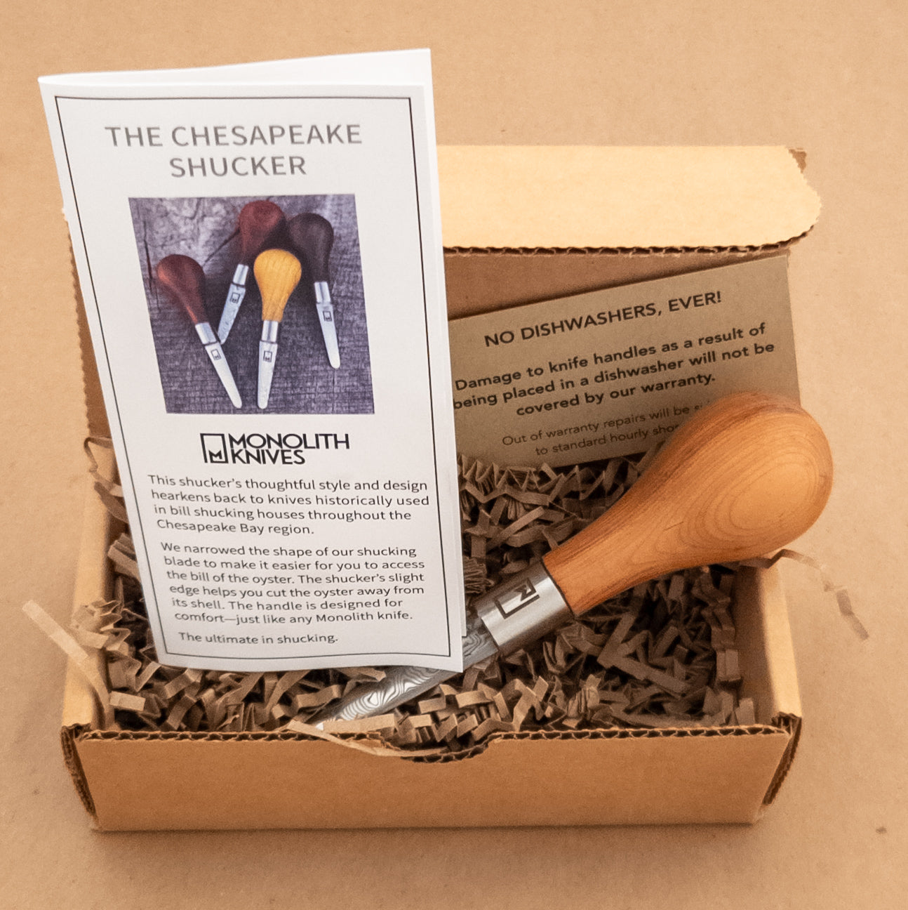 Inspired by the Chesapeake Bay “stabber” shucker, used for generations by watermen, this knife’s rounded handle and precise blade make quick work of oysters. Monolith's version carries that tradition forward.